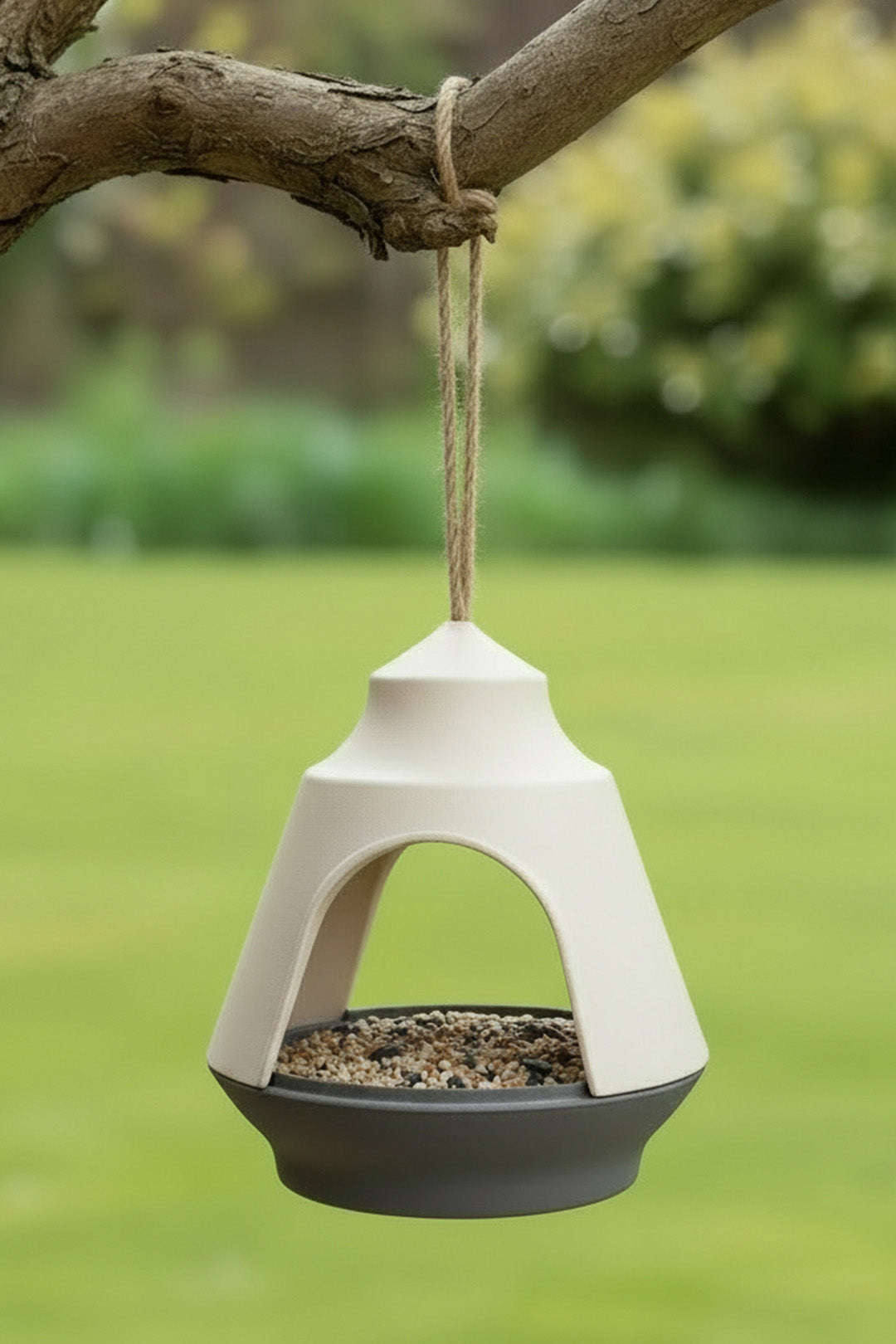 Scandinavian style covered bird feeder made from recycled agricultural waste and resin. This innovative material is suitable for outdoor use, resistant to frost and is easy to keep clean so as to help maintain the health of garden birds.