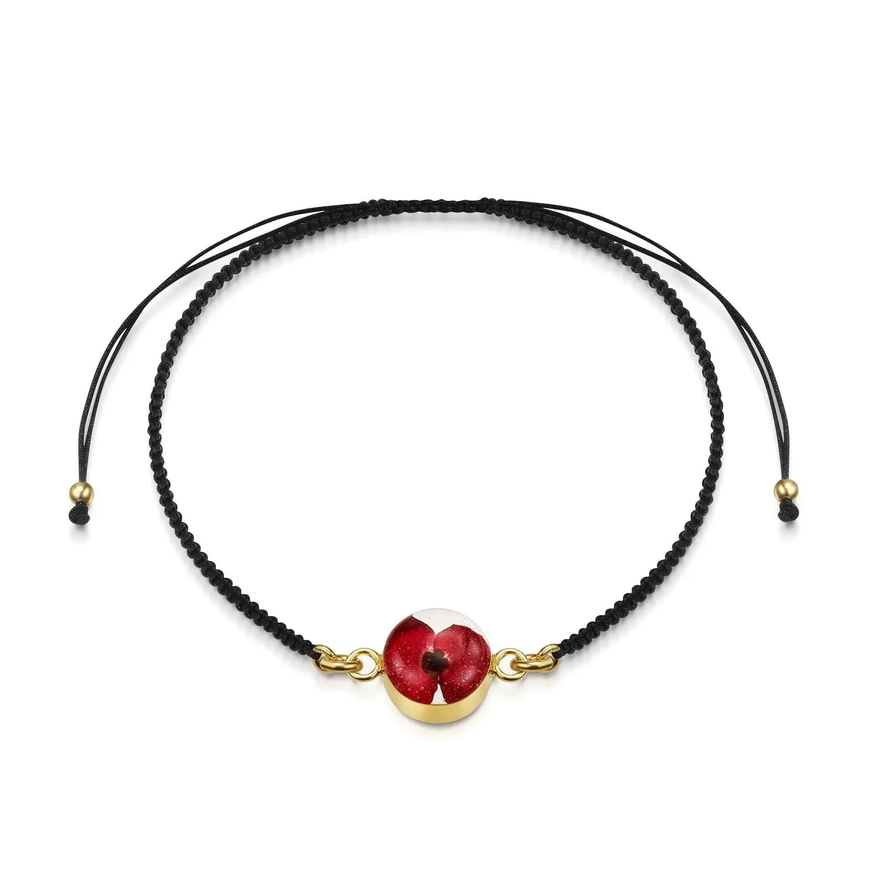 Add a subtle pop of colour to your everyday jewellery with the Shreiking Violet Gold Plated Poppy Flower Charm Bracelet. Set on a black woven cord, the round poppy charm brings a rich violet-red tone with glossy detail, finished with gold plated fittings for a warm, polished look.