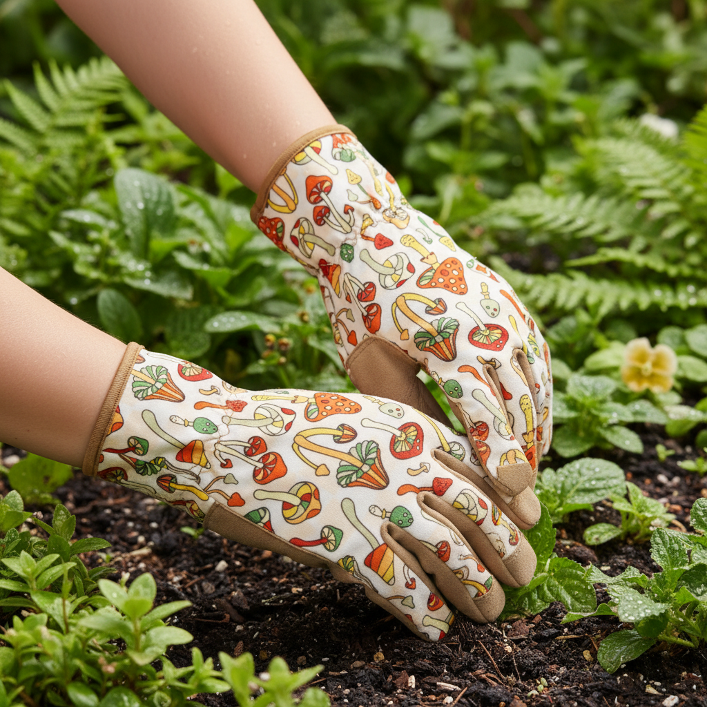 The soft, stretchy fabric features a charming retro mushroom print, while the cushioned palm provides extra comfort and protection when tackling tougher tasks.