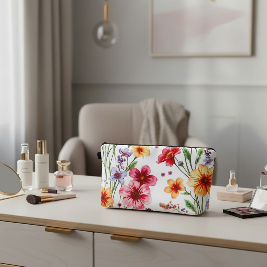 White Flower Meadow Print Zip Cosmetic Makeup Bag NV112507 is a practical accessory with vibrant detailing and secure closure. Ideal for travel, handbag organisation, or everyday use.